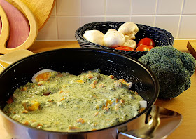 Ohjeen mukaan nyt olisi kuulunut lisätä tuorejuustoa, mutta eihän sellaista tullut ostettua, joten sen sai korvata pieni purkki kookosmaitoa -ja hyvin korvasikin. Mausteeksi vielä 1 rkl sitruunamehua, mikä minulla tarkoitti puolta sitruunaa. Perään heittelin vielä mustapippuria.