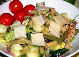 Kuvasta näkyy, että parmesaania oli vuoltu jo melkein kantaan asti ja se oli aika kuivaa. Olisi kannattanut aloittaa uusi juusto, olisi ollut mehevämmän makuista. Pastan määrä tuntui myös suurehkolta nyt, kun kanasta oli vain rintapalat jäljellä. Mutta muutenhan tämän salaatin maku on aina erinomainen ja siitä riittää isommallekin porukalle.