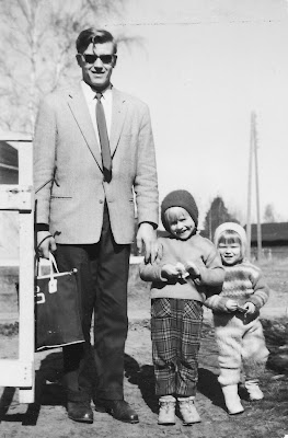 Aivan ihana kuva. Isäsi on niin komea. Ja tuo eväslaukku (eikö se sitä varten olekin?). Kaikilla oli tuollainen. Puku päällä ja kravatti. Vaatteet tekevät miehen sanotaan mitä sanotaan.