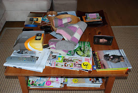 Susanne, sohvapöydällä pitää olla nopeasti saatavilla kaikkea mieleistä viihdykettä (siis mulle), kun siihen istahtaa. Mies pitää ristisanansa toisella pöydällä.