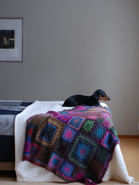Harmaa on hyvä väri, siihen voi lisätä mielentilan mukaan mitä vaan. Makuuhuoneessanne torkkupeitto tuo mukavaa väriä mäyräkoiran lisäksi.