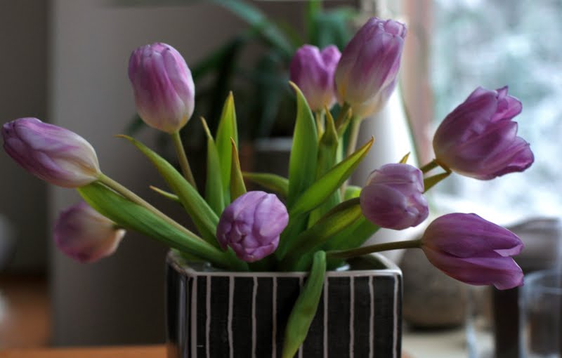 | Hailakan liilat tulppaanit sopivat hyvin harmaaseen kukkapurkkiin. |