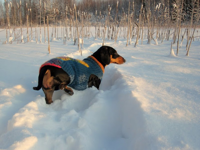 Sunnuntaina jaksettiin vääntäytyä  vasta puoliltapäivin ulkoilemaan neljäntoista asteen pakkaseen. Vilma sai neuletakin päälle ja emäntä sen iänikuisen toppapukunsa. Onneksi tuuli oli tyyntynyt ja aurinko paistoi, ja se tuntui sielussa asti.