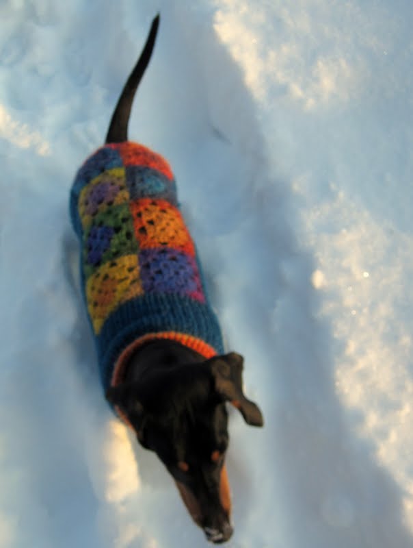 Kirjailijatar, koiralle on kiva kutoa, kun valmista tulee kohtuu nopeasti eikä tarvitse kinastella väreistä!