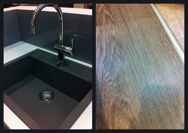 | Vasemmalla Silgranit-allas. Lattiaan tulee vinyylikorkkia, mutta harmaampana. |