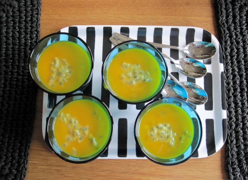 - Halkaise passiohedelmät ja kaavi niiden sisus mangopyreen joukkoon. Mausta tarpeen mukaan sokerilla ja kaada seos hyytyneen pannacottan päälle.Tää toimii.