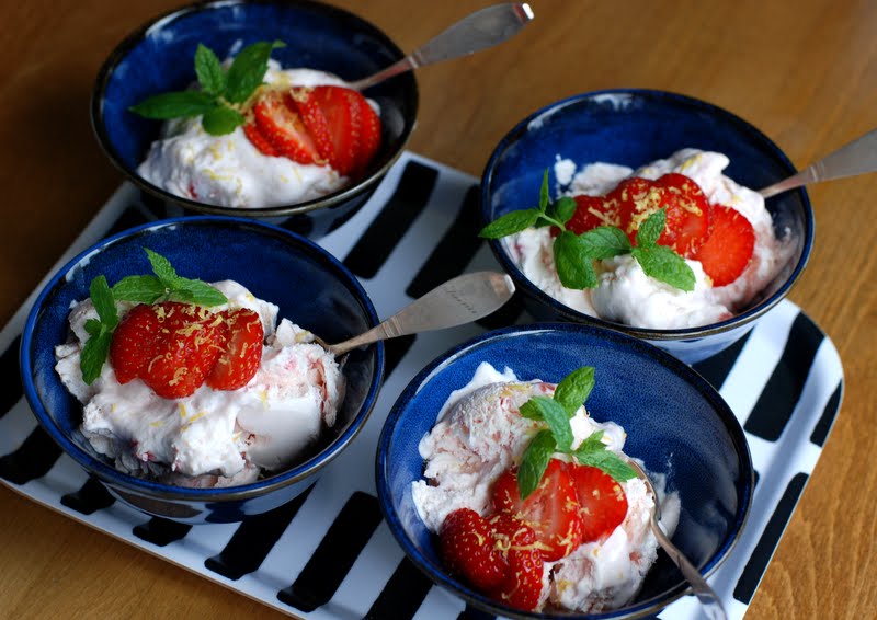 Kesäkuun Pirkka-lehdestä huomasin uuden jäätelöohjeen. Jäätelökone meillä on ollut jo useamman vuoden ja olen tehnyt sillä erilaisia jogurttipohjaisia vähärasvaisia jäätelöitä. Nyt tämä Pirkan ohje näytti helpolta ja siinäkin oli jogurtti yhtenä ainesosana. Tuoreet mansikat ja sitruuna kuitenkin olivat se houkutin, joka pani repäisemään sivun talteen.