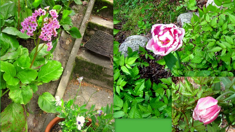Edes pientä kukintaa. Vain kolme tulppaania on tänä vuonna noussut. Istutin toissa vuonna kolmeen penkkiin paljon erivärisiä tulppaaneja. Jo silloin oli määrä kaataa suuret meitä varjostavat kuuset kolmen talon väliltä. Tuli muuta tärkeämpää, kuten seuraavanakin vuonna. Varjossa ollaan edelleen. Nyt on taas lievä lupaus, että yhtiö kaataa suuret, kaiken voiman vievät havupuut. Eihän täällä metsässä eletä, vaikka metsän reunalla ollaankin.