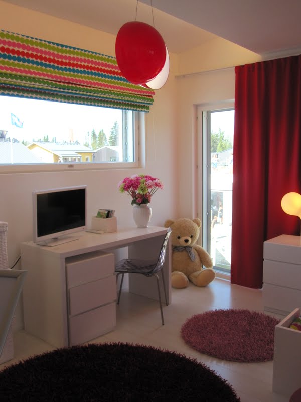 Lastenhuoneissa oli käytetty rohkeita värejä. Nämä sohvat olivat herkulliset, mutta en ole varma, viihtyvätkö nappulat aikuisten tapaan laiskanlinnoissa seurustelemassa; veikkaan että mieluummin lattialla maaten.