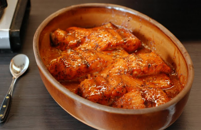 Kastike sivellään sitten lohipalojen päälle. Silikoninen pullasuti on tässä erinomainen väline, vaikka ei sattunutkaan tulemaan kuvaan mukaan. Kirjassa Pipsa suosittelee valmistamaan kalan uunipellillä leivinpaperin päällä. Voisi olla hyvä ajatus, nämä palat tulivat vähän turhan tiukkaan. Olisi mukava sivellä kastiketta kalan reunoillekin.