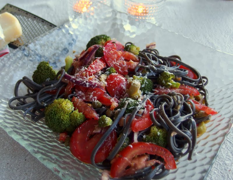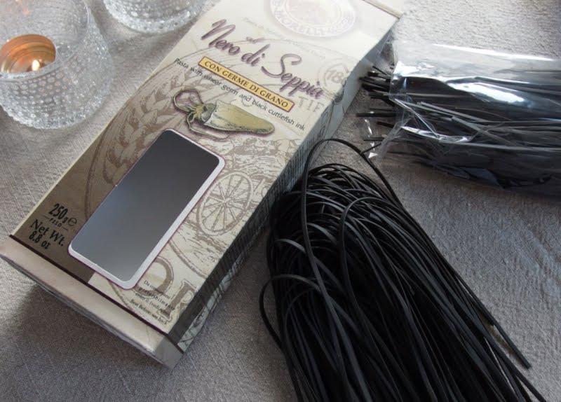 Kaapissa oli mustaa pastaa, joka sopi kivasti väreihin. |