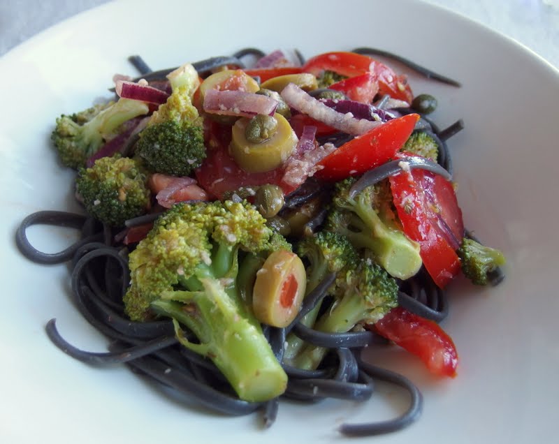 Jostakin syystä en miellä pastaa kesäruoaksi. Ehkä siksi, että se tarjotaan meillä Suomessa usein raskaitten kermaisten kastikkeitten kanssa. Tässä on kuitenkin yksi kesään sopiva ja vielä kylmänä tarjottava pastaruoka, jonka tarvikkeetkin löytää helposti kotoa. Ohje on Sophia Lorenin kuuluisaksi tekemä, ja on varmaan peräisin jostakin Etelä-Italiasta. Minä otin oman ohjeeni vuosia sitten Arleenalta.