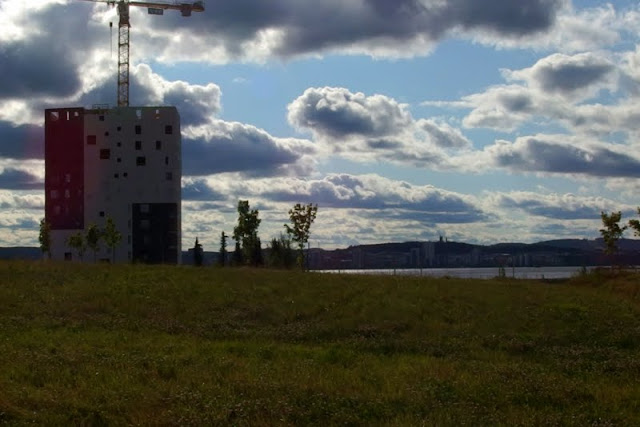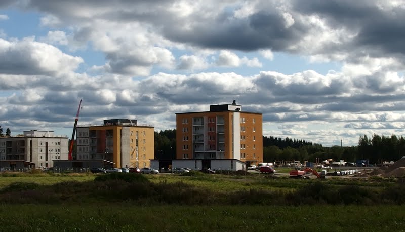 Omakotitalojen perustuksia tehdään kovaa vauhtia ja muutama on jo nousemassa. Noista kerrostaloista en tiedä muuta kuin, että kolmessa korkeimmassa on täkäläisittäin hurjat hinnat: pieni kaksio maksaa noin 200 000e.
