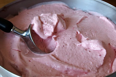 Pääruoka oli hyvää kaali-broileripataa, mutta ei ollenkaan nättiä, joten liitetään loppuun kuvaa sen sunnuntain jälkiruoasta. Pyöritin jäätelökoneella mansikkaisen jogurttijäätelön, johon lisäsin keltuaisten lisäksi jostakin ylijääneen kuohukermankin. Oli siis vähemmän vähärasvaista kuin mitä tavallisesti teen. Kokeilin ensimmäistä kertaa ostamaani Dansukkerin glukoosisiirappiakin, jonka tarkoitus on siis estää jäätelöä kovettumasta kivikovaksi pakkasessa.