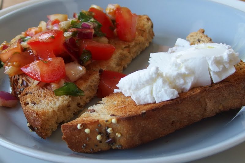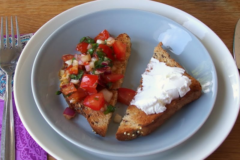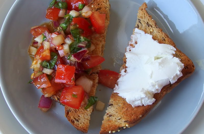 Tomaattisalaatti siis lusikoitiin paahtoleivän päälle ja vuohenjuustoa toiselle puolikkaalle. Pieni alkupala oli valmis!