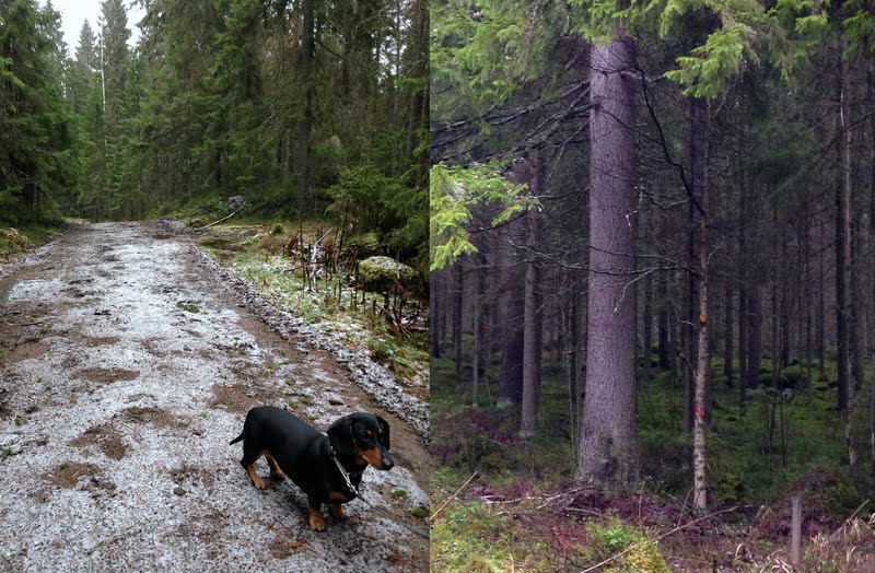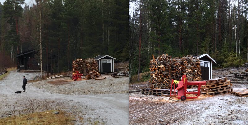 Metsänraivausta on ollut tekeillä ja se on ollut tarpeen. Omituista kyllä maa on näissä kuvissa valkoinen, vaikka en muista sellaista. Monena päivänä on käväissyt jonkinlainen millinkerros lunta ja jotain sellaista satoi tänäänkin. Minun mielestäni se oli hyhmää. Miehen mielestä hyhmää on se sose, jota on jään ja rannan välissä keväällä. Minun mielestäni hyhmää voi myös sataa, silloin kun se ei ole räntää, joka on märkää, eikä lunta, joka on hiutaleina. Liekö sitten sitä kuuluisaa alijäätynyttä vettä? Puhumme muuten usein sanoista ja niiden merkityksistä, kaksi entistä kielitieteilijää.