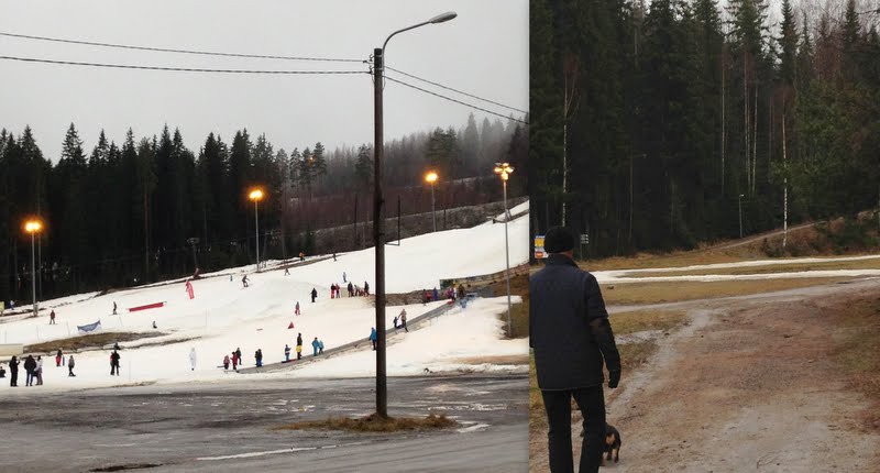 Edellisillä pakkasilla tykitetty lumi on pysynyt rinteissä, vaikka lumetonta vuodenvaihdetta on muuten vietetty. Ei ole kaksiset kelit venäläisturisteilla, joita tänne keskiseen Suomeenkin on aika paljon tullut. Ensilumen ladusta on pohja jäljellä ja siellä on sivakoijia näkynyt tähän asti. Siis sieltä ei mennä lenkille.