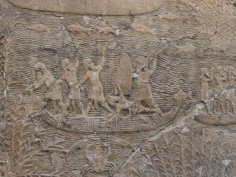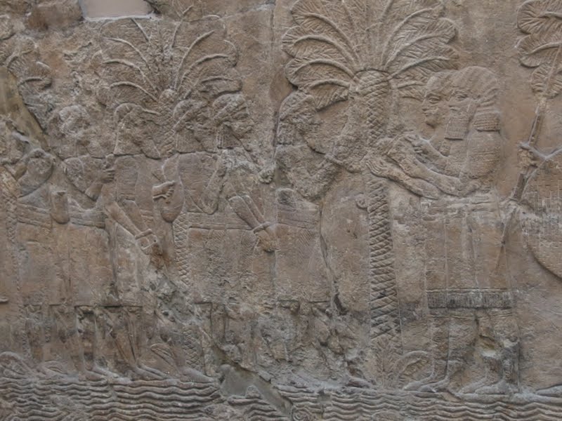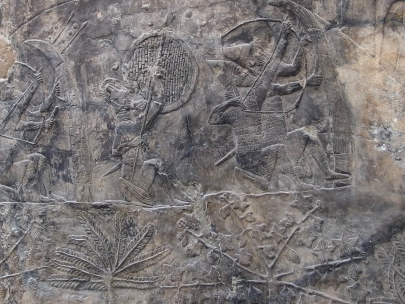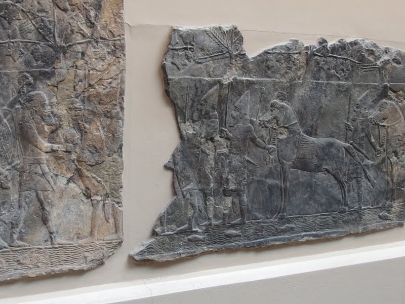 Nämä seinäpaneelit ovat Ninivestä ajalta 600 v e.K. Assyrialaiset siinä käyvät sotaa Irakissa ja kuljettavat vankeja. Urotöitä näihin on siis hakattu. Mielenkiintoista katsella tällaisia kuvakertomuksia lähes kolmen tuhannen vuoden takaa!