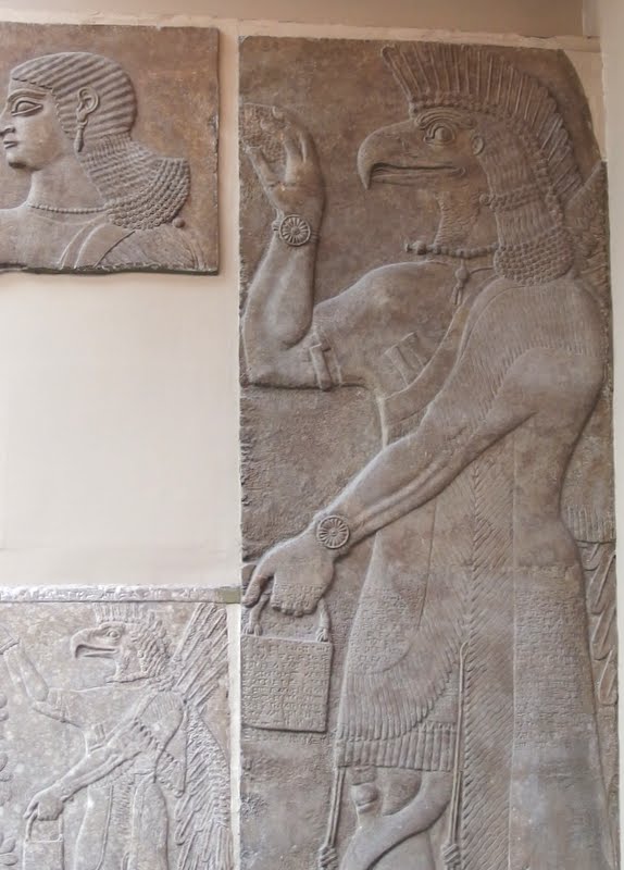 Nubialaisia, assyrialaisia tai joitain muita, mutta hauskoja setiä ainakin. Lihaksikkaita uroita, joilla on linnun pää, koruja ja käsilaukku. Siivet selässä vielä. Siskoni mielestä ne ovat enkeleitä.