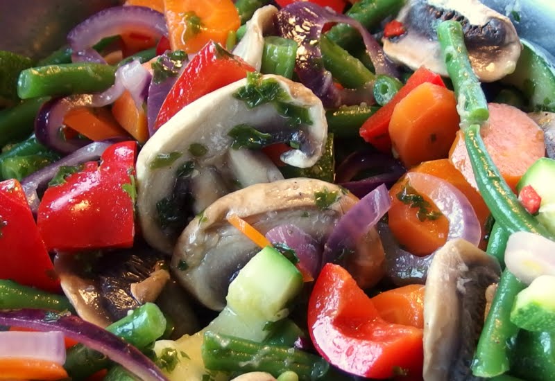 4. Ensinnäkin juutuin kuolaamaan noita marinoituja vihanneksia, niistä tykkään ja harmittelen, kun omatekemistäni unohtui persilja. Mutta hyvää sapuskaa on.