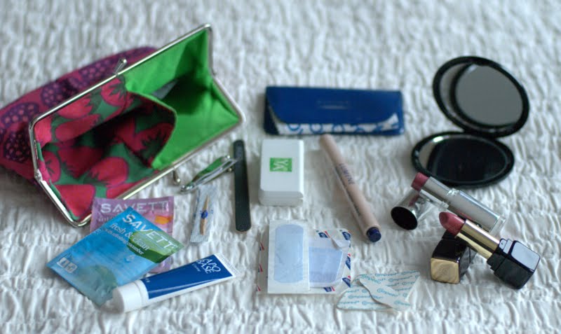Minulla on aina kaikki tarpeellinen mukana. Mitä täältä ei löydy, sitä ei tarvita! Laastaria joka lähtöön, pienessä rasiassa mukana särkylääke, antihistamiini ja verenpainelääkkeet. Kynsiviila ja -leikkuri, hammastikkuja, silmälasipyyhe, savetit. Ennen kuljetin mukana puuteriakin, mutta huomasin sen tarpeettomaksi ja vaihdoin pelkkään Macin kaksiosaiseen peiliin.